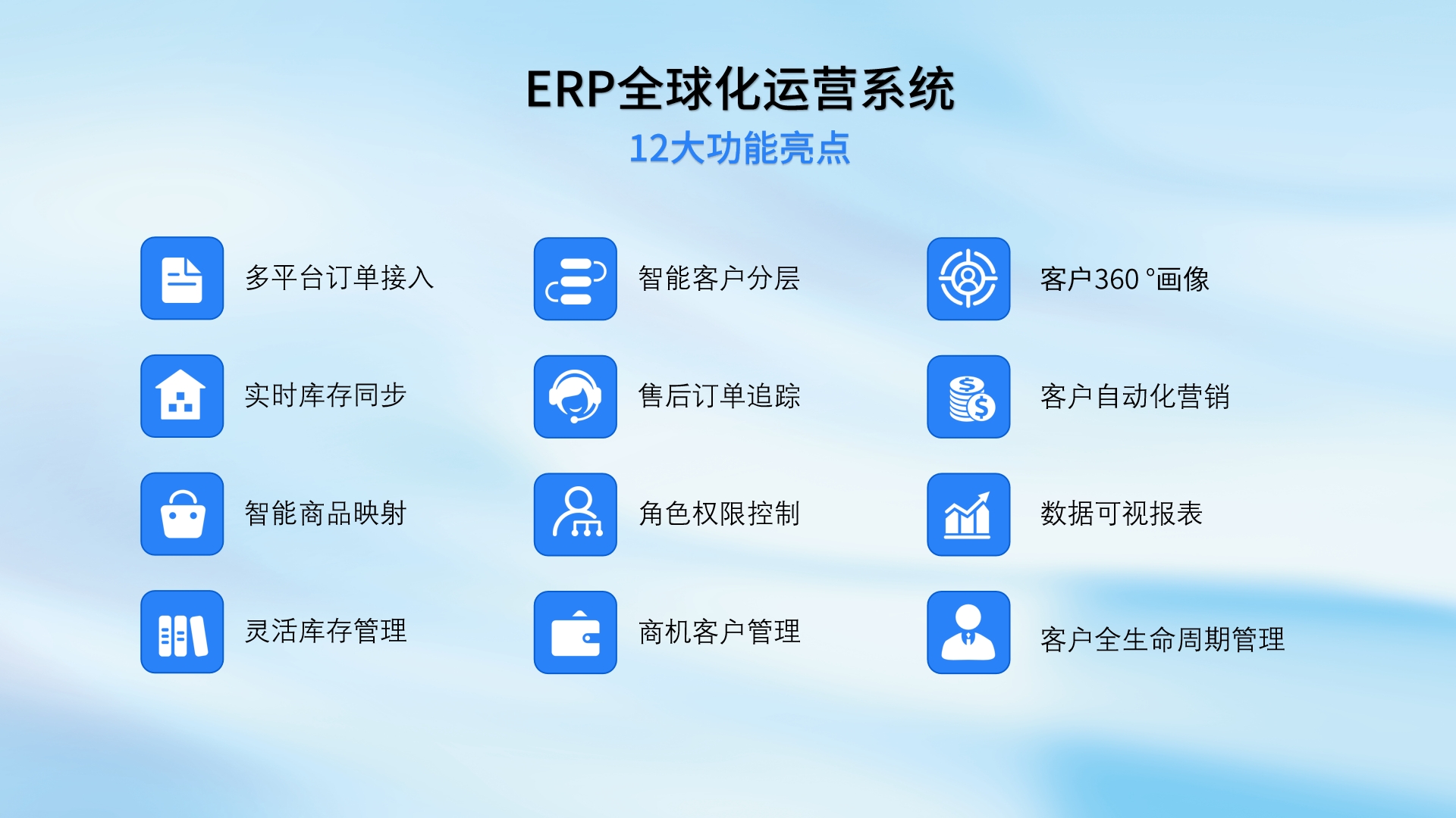 跨境电商系统 关于我们 联系我们 跨境电商系统 关于我们 联系我们 免费咨询 ERPx CRM一体化运营管理系统 让跨境运营更高效数据安全/系统支持/API开放性免费咨询 售后一对一服务 售前咨询售后服务 更新迭代快 持续更新迭代 支持多语言 系统多语言无缝切换 获客·订单·客户·营销 简洁、专业的跨境电商系统 技术实力